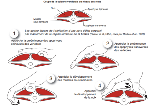 • Note 3 – Ovin en état. Les apophyses épineuses forment seulement de très légères ondulations souples ; chacun de ces os ne peut être individualisé que sous lʼeffet dʼune pression des doigts. Les apophyses transverses sont très bien couvertes et seule une forte pression permet dʼen sentir les extrémités. La noix du muscle est « pleine » et sa couverture adipeuse est moyenne.